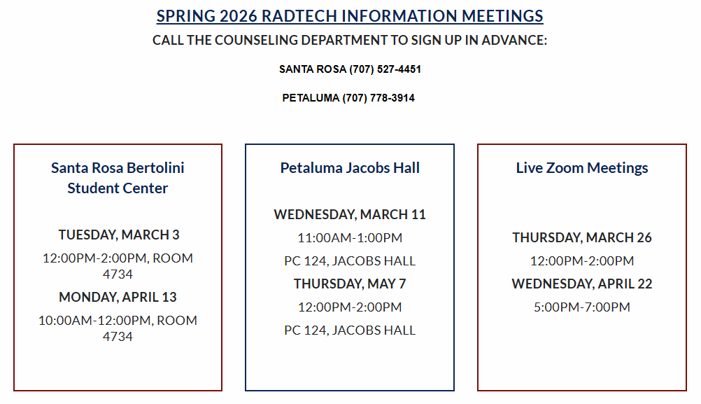 The Radiologic Technology Program at Santa Rosa Junior College offers exceptional teaching and learning in support of students to prepare them for workforce success as competent radiologic technologists in the healthcare community that they serve.